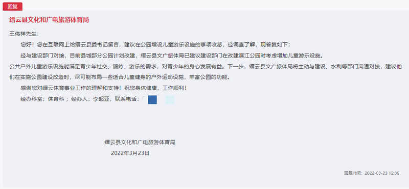 縉云縣文化和廣電旅游體育局對此高度重視,并及時進行了回應;貜头Q,目前縣城部分公園計劃改建,縉云縣文廣旅體局已建議建設部門在改建濱江公園時考慮增加兒童游樂設施。對此,人民網浙江頻道與縉云縣文化和廣電旅游體育局體育科工作人員李超亞取得了聯系,經了解,縉云縣山多平地少,因此,縣城的公共健身用地較少!拔覀冊谝巹澾^程中有針對性地將一些運動場地、健身器械設置到城市公園中,但在兒童游樂設施上規劃較少,網友的建議也對我們的工作有所啟發!崩畛瑏喺f。
