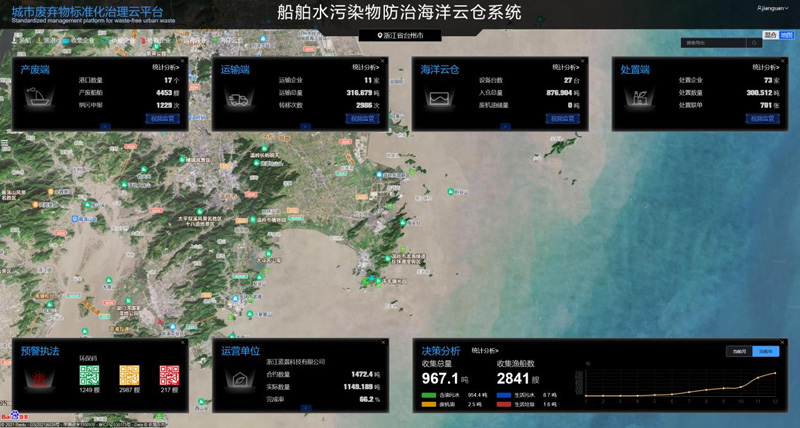海洋云倉系統是在臺州中心漁港設立的船舶污染物集中預處理中心,可分類回收含油污染物、生活污水、廢鉛酸電池、生活垃圾等海域污染物。海洋云倉系統通過5G網絡接入云端,將收集的數據進行實時回傳,同時部署VR相機,利用5G大帶寬特性,監控中心可實時掌握海洋云倉系統運轉情況。漁民只要在“浙里辦”手機端發起污染物上交申請,系統就會就近派單,通知專業船舶上門收集。海洋云倉在收集到一定量級后,會通知有專業資質的運輸車,把廢油運輸到有專業處置能力的公司處置或者再生利用,減少后期運輸和處置成本。