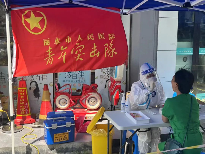 4月9日,蓮都區開展大規模核酸檢測。麗水市人民醫院主要負責蓮都區白云街道、紫金街道及兩所學校共68個點位300多個通道。在院部統一指揮下,360余名醫護人員迅速集結分別前往各個檢測點位。團委副書記李王駿等團員青年200余人參與其中,在抗疫一線,他們頂著烈日進行著核酸采集工作,對于行動不便的居民,他們不辭勞苦親自上門采樣;在方艙實驗室里,他們每天完成著數十萬人次的核酸檢測。