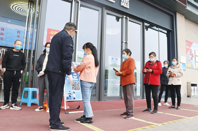 4月17日,記者在金華新農貿市場入口看到,工作人員正嚴格按照重點場所“逢進必掃”原則,引導市民掃描“金華防疫碼”。前來購物的市民自覺按照規定間隔排隊,有序掃碼入場!俺瞬榭唇】荡a、行程卡,我們著重查看24小時內核酸檢測結果,避免聚集性疫情發生!笔袌龉ぷ魅藛T說。(周垚)