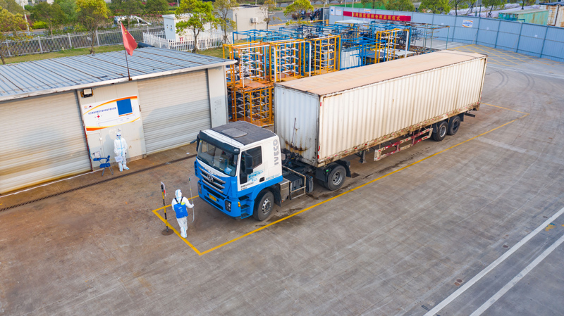 進入倉庫入口檢查點后,工作人員將根據放行單再次查驗相關信息,之后車輛進入裝卸貨通道,經消殺后開始卸貨。待卸貨完成后,工作人員將再次發放放行單、貼封條,由引導車引至高速口駛離,全程閉環管理。