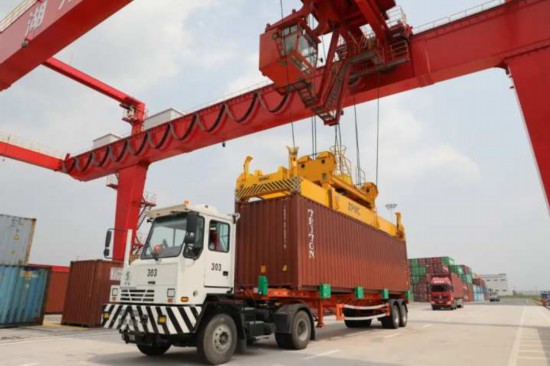 4月19日下午1時許,一輛輛來自湖州南潯、德清等地外貿企業的大型貨車,陸續駛入地處南太湖新區的湖州鐵公水綜合物流園,?吭诤萆细鄞a頭。隨即,龍門吊將貨物一一卸下,等待裝運。