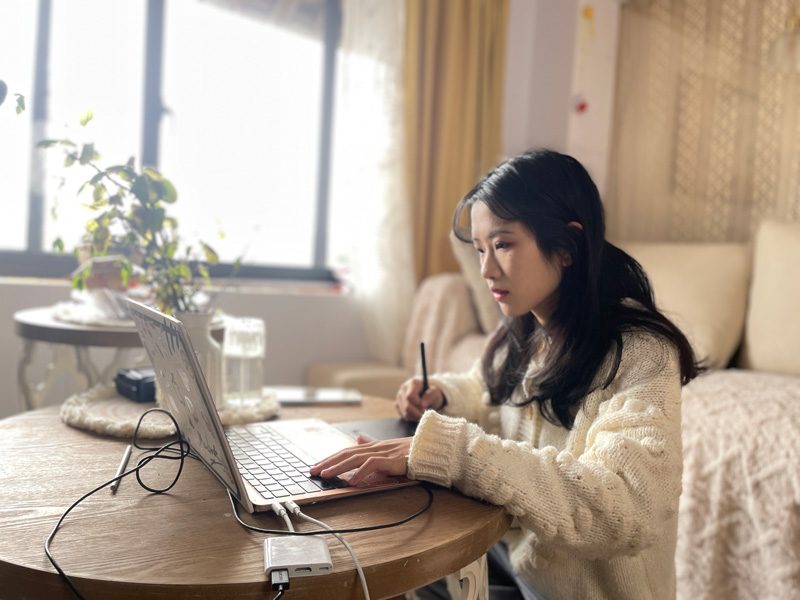 劉雯悅用電腦和手繪板設計漢服。松陽縣融媒體中心供圖