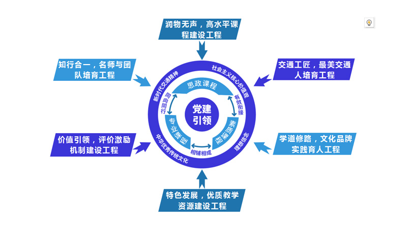 該校將社會主義的理想信念核心價值觀、交通強國的民族情懷、精益求精的工匠精神和中華優秀傳統文化等融入專業課程,構建了以“知行合一,名師與團隊培育工程”“潤物無聲,高水平課程建設工程”“交通工匠,最美交通人培育工程”等“六大工程”建設為抓手的新時代交通人才培育課程思政建設體系框架。