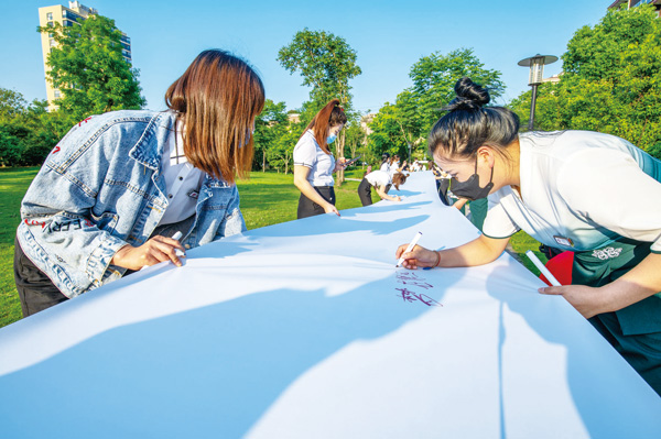 5月3日傍晚,金華開發區團委、金華孝行助老公益服務中心聯合在市區和信公園舉行迎五四“青春心向黨、奮進走前列”百米長卷路簽活動,吸引了不少團員青年和過往市民在長卷上書寫青春寄語。五四青年節到來之際,金華開發區團委在市區主要公園連續開展迎五四“青春心向黨、奮進走前列”百米長卷路簽活動,旨在用長卷記錄青年的奮進姿態,激發青年的奮進力量。(胡肖飛)