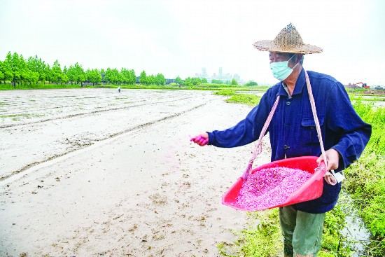 近日,在金華婺城區乾西鄉金泉畈千畝糧食功能區,金華市群飛合作社組織人員搶種早稻。據介紹,金華市群飛合作社今年在金泉畈種植早稻933畝,前段時間受新冠肺炎疫情影響,機械和人員進不了場地,到當天還剩下10多畝早稻沒有播種。催芽過的稻種放置后芽頭長長,無法使用直播機器,現在復工復產正在有序啟動,合作社立即組織人員手工直播搶種。(時寬兵)
