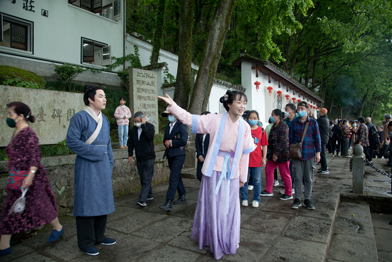 一路走來,游客不時會遇到古裝打扮的漁父、高士、書生、仕女、樵夫,他們或江邊垂綸,或牧笛橫吹,或泉邊烹茶,或亭中撫琴,或路邊歇腳,或山中砍柴,或石上對弈,或松下閑談……個個不緊不慢,悠然自得,游客仿佛進入了《富春山居圖》中,無限好奇,不斷驚喜。