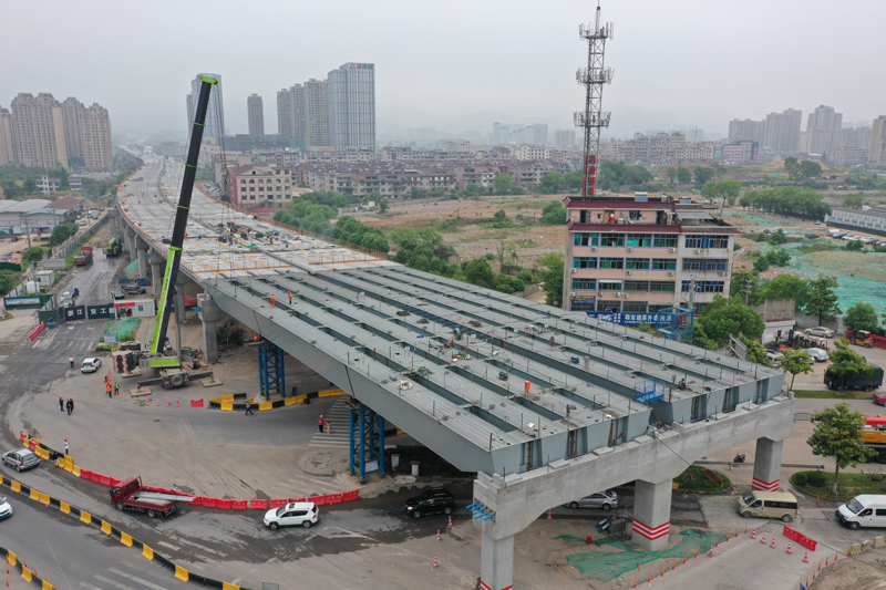 為最大限度減少施工對城市交通的影響,義東指揮部及參建單位積極對接交警部門,周密制定交通組織方案,合理安排施工順序及施工時間,采用支架法分三段24榀進行吊裝,并對施工區域地面道路進行了3次改道和交通轉換,保證了施工期間地面道路能夠正常通行。吊裝過程中,項目領導現場帶班,安全、技術人員全程盯控施工,確保吊裝施工的每個環節不留盲區、不留死角,外圍則由引導員進行交通引導,順利完成了鋼箱梁吊裝施工。