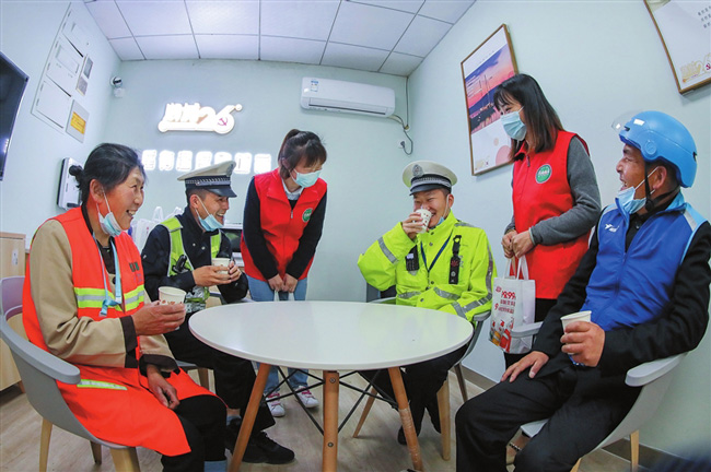 連日來,湖州龍泉街道華豐社區組織黨員志愿者在“城市溫度26°”紅色驛站開展暖心服務,為環衛工人、快遞小哥、交警等戶外工作者送上生活用品。(陸一平)