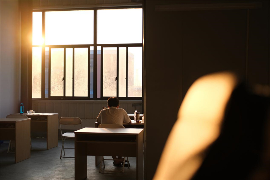 夕陽西下,方艙里專門設置的學習區里,還有人在余暉中啃著書本。