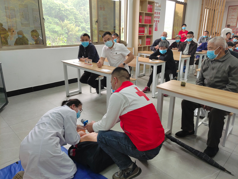 活動中,紅十字救護隊員們和石達石街道衛生院醫生現場進行了AED應急救助操作流程演示,邊示范邊講解注意事項,向群眾教授互救自救基本知識和技能。