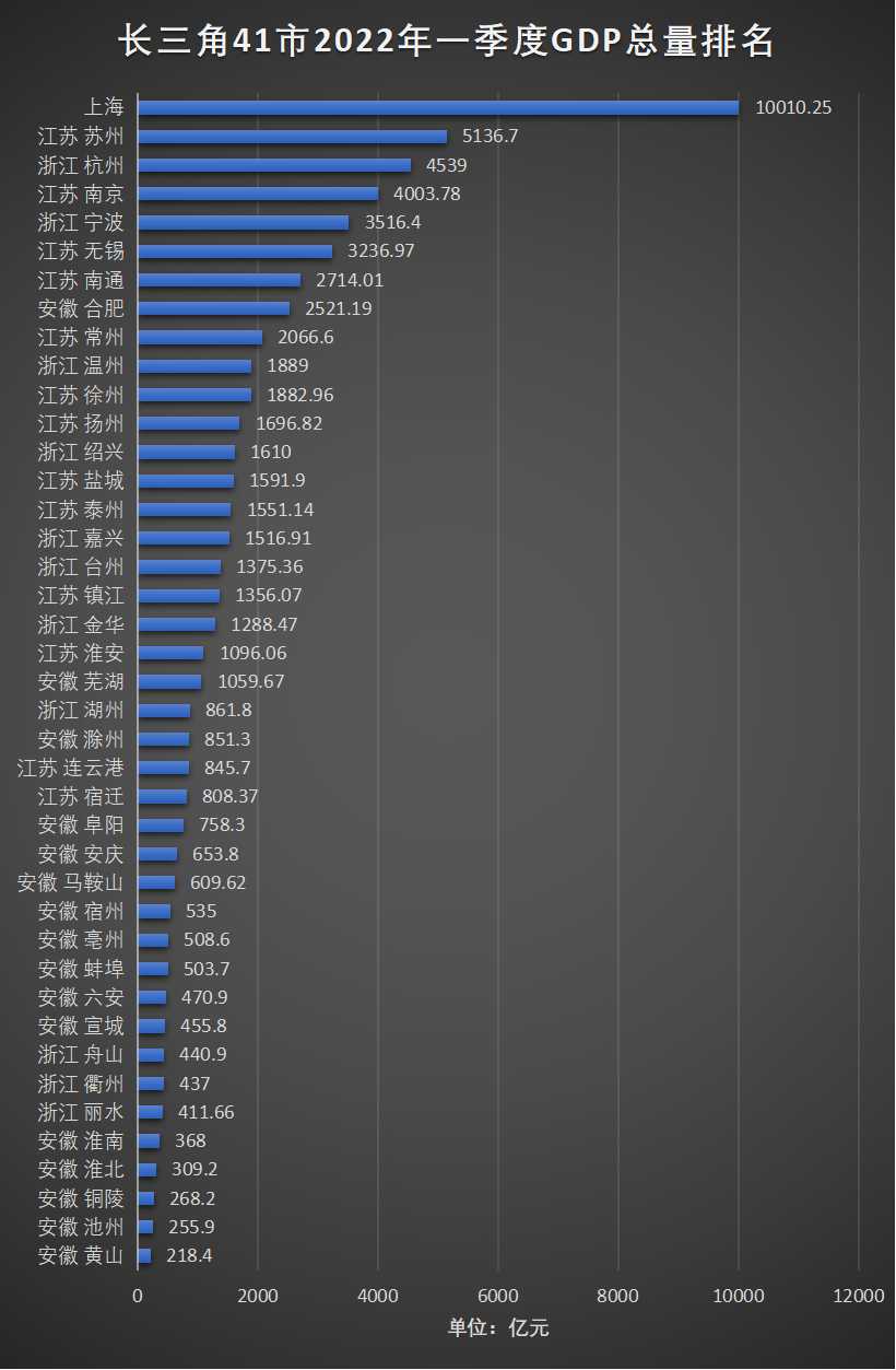 2022年一季度,長三角41市中GDP超千億元的有21個,超2000億元的有9個。江蘇還是最大贏家,排名前10的城市中占了5個(蘇州、南京、無錫、南通、常州),浙江占3個(杭州、寧波、溫州),安徽只有合肥進入前10。