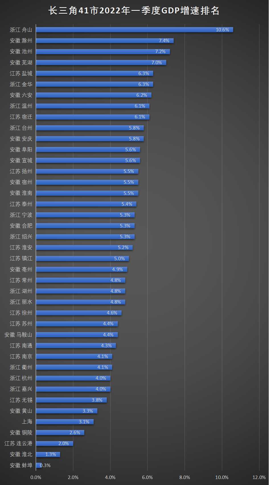 2021年長三角41市中GDP增速第一位的蕪湖,2022年一季度增速為7%,經濟總量突破1000億元,達到1059.67億元。