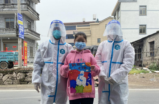 在天臺項家村的核酸檢測現場,剛結束全村采樣工作的“大白”也收到了一份暖心小禮物——一幅小朋友的親筆水彩畫《致敬逆行者》。此舉讓已經離家近半個月的醫務人員深受感動,臉上掛滿止不住的笑!捌鋵嵶詈玫亩Y物就是群眾的理解和支持。這次支援我感受到了洪疇人民滿滿的善意,真的很開心!币晃会t務人員說。