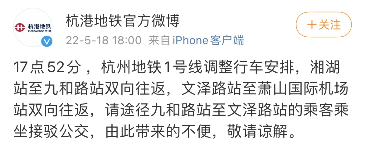 杭港地鐵發布官方運營調整公告,截至當天17點52分,杭州地鐵1號線調整行車安排,湘湖站至九和路站雙向往返,文澤路站至蕭山國際機場站雙向往返,途經九和路站至文澤路站的乘客可以乘坐接駁公交。