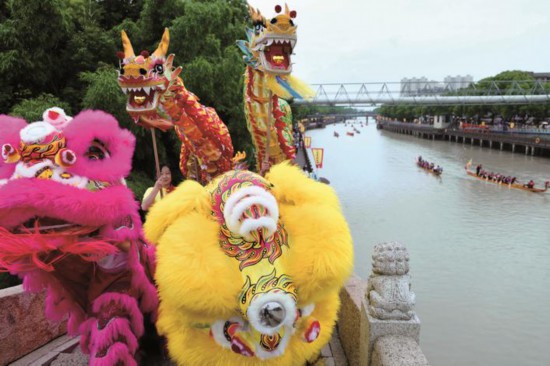 自2018年以來,每年的端午節,嘉興桐鄉都在崇福鎮舉辦端午民俗風情活動,這已是第五屆;顒臃譃椤懊袼渍寡荨薄岸宋缑袼仔恪薄八雾嶏L情展”“宋韻文創美食集”四大主題,包括運河鼓舞、龍獅、大纛旗表演、“年年有魚”魚燈表演、“風雅桐鄉十二樂章”龍舟競渡、“舌尖上的端午”美食雅集等15項活動,從早上9時30分啟動,一直延續到晚上8時。
