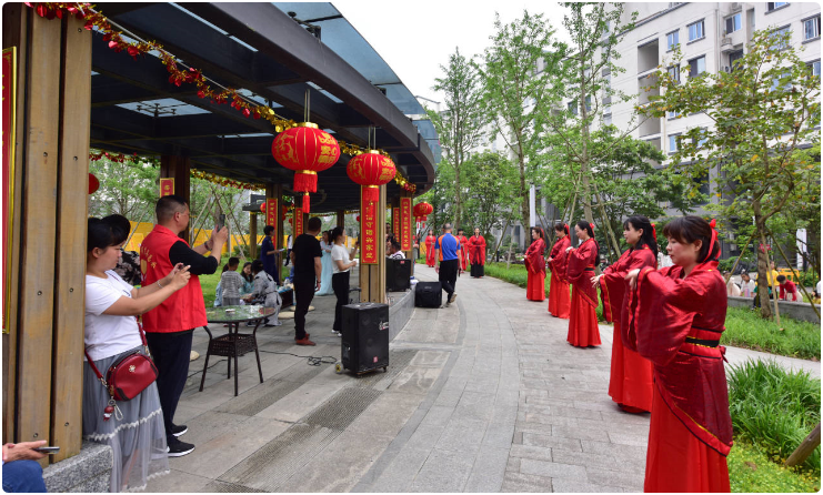 記者在現場看到,小區業委會準備了多種口味的粽子分發給業主,與業主們共度端午佳節。在小區的“十禮長廊”,還有小區業主們自編自導自演的《禮舞》、漢服秀表演和器樂表演,小朋友們則表演了詩朗誦,現場熱鬧非凡,吸引了200多名業主駐足觀看,并用手機拍照留念。