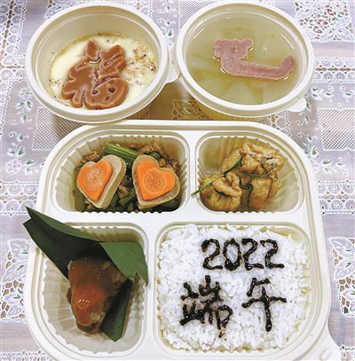 為了做好“端午特餐”,附海志愿者在食材選擇、烹飪方式等方面花了不少心思!澳憧,這碗冬瓜湯上有一條用火腿腸雕的小龍舟,那是現炸油豆腐做的‘福袋’,每道菜都有端午元素!敝驹刚哂嘌嗥礁嬖V筆者,他們還設計餐盒專用包裝,配上菜單卡片,上面寫有每道菜的寓意。