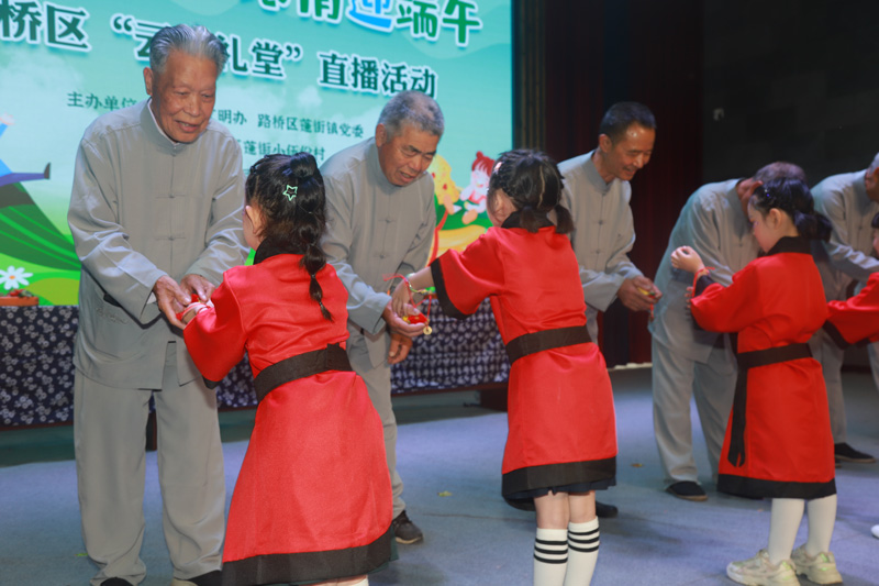 在蓬街鎮浦東村文化禮堂,梁大爺看著屏幕前的端午賜福禮,頻頻點頭。屏幕上,蓬街本土曲藝專家張日美主持端午賜福禮,只見8位學童向長者鞠躬行拜禮,長者借雄黃酒“點額畫王”,并為孩子們系上“長命縷”,賜予平安、健康、幸福,學童則回贈艾草香包,祝福老人身體安康、長命百歲。