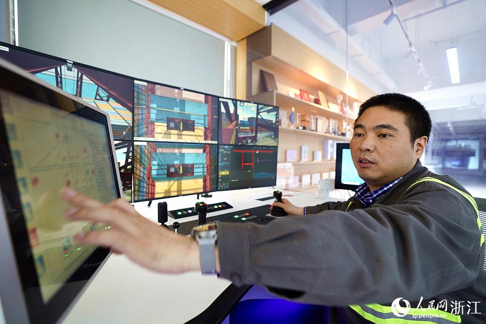竺士杰在操作橋吊遠程控制系統。人民網 郭揚攝