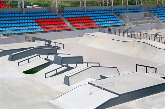 從亞運輪滑館往北走,是亞運會滑板比賽場地。該公園分為碗池和街式兩個場地,共設置了860余個座椅供觀眾觀賽和運動員休息;逋氤貓龅刈钌钐幖s為3米,一側包含了兩個巨大的垂直壁,豐富的滑行路線為參賽選手提供了更多的挑戰和創意發揮。街式場地則具有豐富的地形,拋臺、桿子、階梯等障礙物也一應俱全,以滿足不同需求的比賽選手使用。