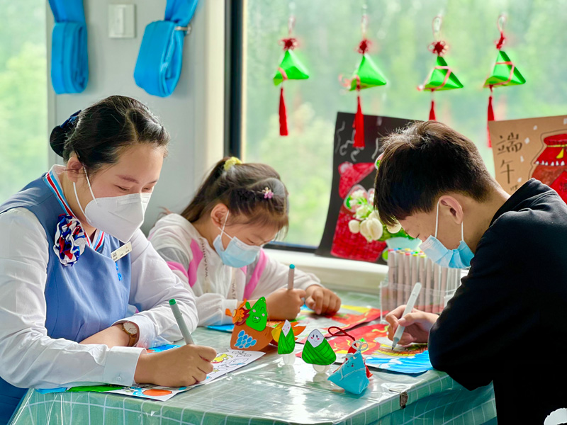 K1396次列車工作人員和小朋友們一起做端午節手工。謝燁攝