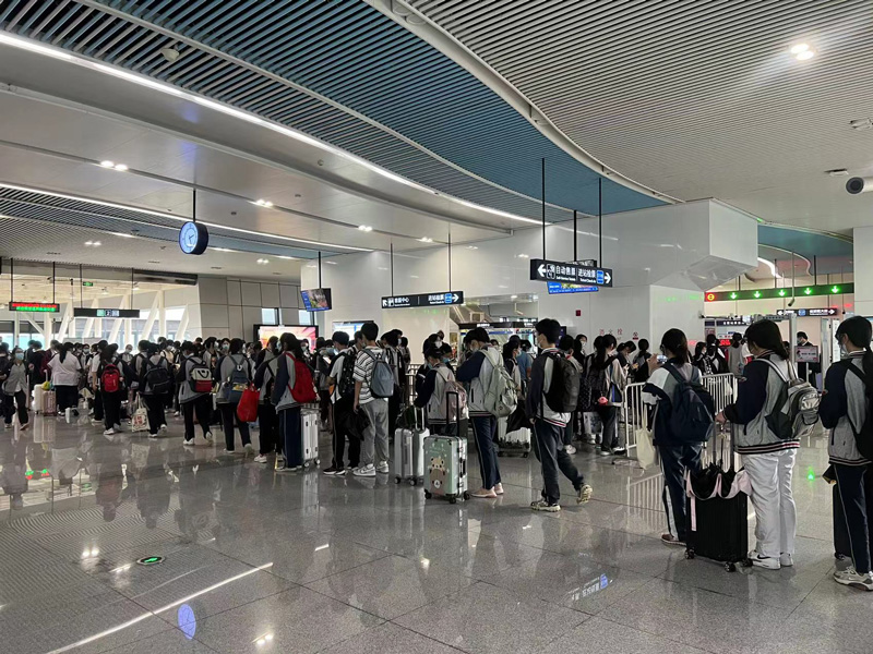 6月2日一大早,溫州軌道交通S1線各車站人頭攢動,進站測溫點處排起了長隊,客流在短時間內增加到近千人的峰值。由于周邊五所學校學生同時放假,端午“客流大軍”如約而至,甌華站客流全天突破三千人次。為維持站內的順暢秩序,幸福軌道公司通過與軌道公安及周邊學校的有效溝通,針對性加強了應對大客流的通行能力,從行車組織、客運組織、設備保駕、安全維穩、疫情防控等方面做好具體應對方案!跋裎覀儎榆嚹险臼谴罂土鹘煌屑~站,我們就會提前聯系高鐵站,對客流做一個總體分析和預判!避囌鞠嚓P負責人介紹。同時,車站提前在站廳非付費區擺上鐵馬及導流帶,不僅提高了站廳的利用率,也有效避免了購票排隊與過安檢排隊的乘客相互影響。