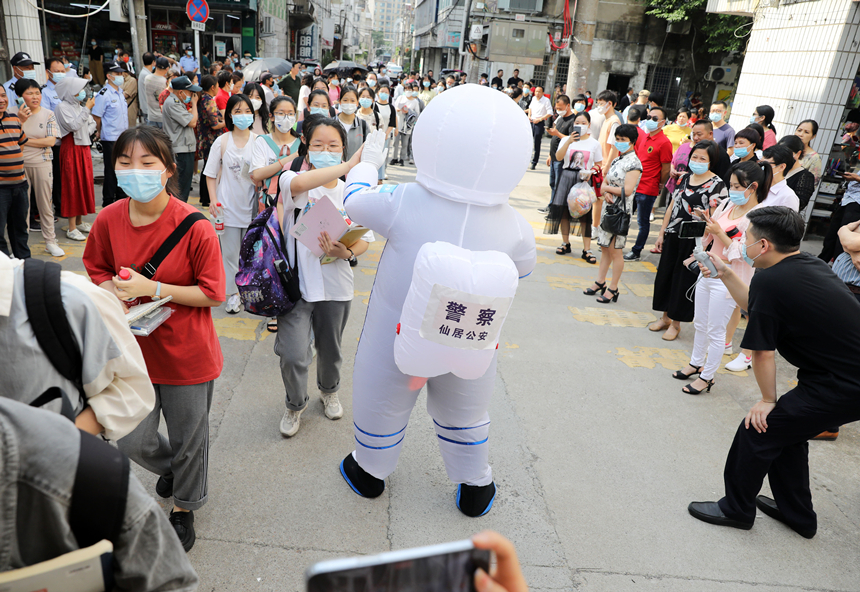 人群中,一個身著白色充氣防護服的“大白”,正在和考生們擊掌、碰拳,給學子們加油并送上高考祝福!按蟀住北澈蟮摹熬臁倍,格外醒目。原來,這個“警大白”是位警察蜀黍,來此維持考點秩序。