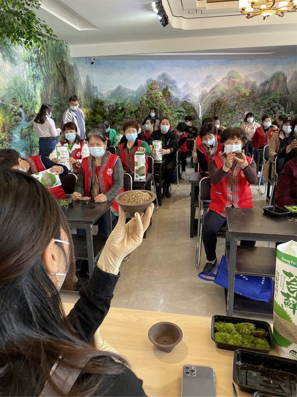 在蘚然文化主題館里,“畬大姐”們在老師的指引下,認真學習苔蘚微景觀的制作工藝。在聽取了專家老師淺顯易懂的講解后,大家紛紛小心翼翼地放上植物、雕塑、擺件,并覆蓋上砂土,噴灑少許清水。沒過多久,一瓶瓶“苔痕上階綠,草色入簾青”的微景觀作品便誕生了。