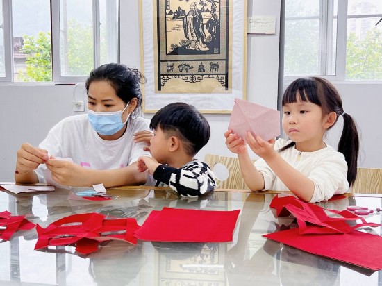 在寬敞明亮的特色體驗室里,一幅幅生動、精致的樂清細紋刻紙作品有的掛在墻上,有的擺在長桌上,大大小小的作品令人驚艷不已。隨后,樂清細紋刻紙傳承人鄭梅貞為孩子和家長們授課,只見她手指翻飛,用嫻熟技藝,很快就將一幅精致的作品展現在大家的面前,孩子們看了紛紛拍手,躍躍欲試!拔乙彩堑谝淮误w驗樂清細紋刻紙,真的是看起來容易剪起來難!币幻议L笑道,孩子們很感興趣,上完課后還覺得不過癮,跟鄭老師又多要了一些紙張,想帶回家繼續練。