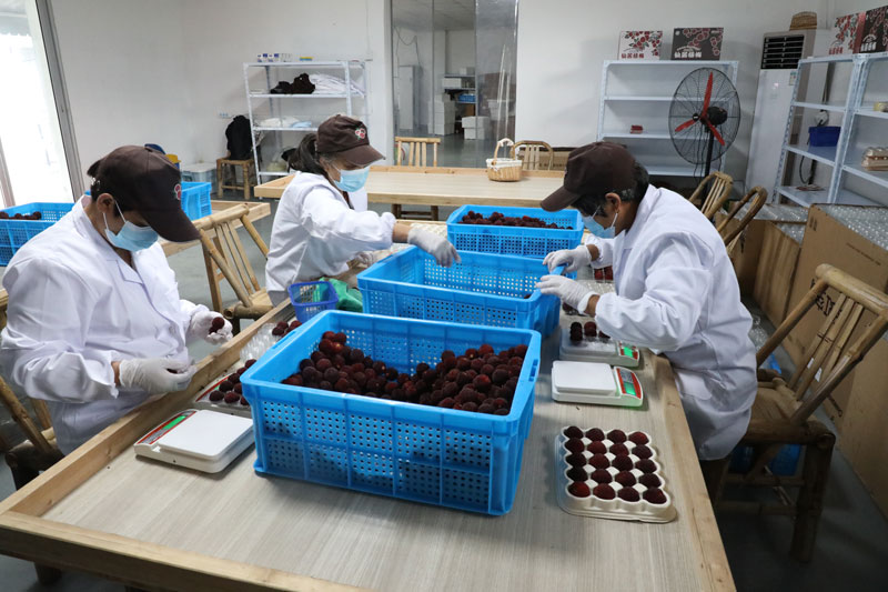 “這些都是我們凌晨采摘的,明天晚上10點這批楊梅便能搭上開往迪拜的飛機,經過8到10個小時航行,預計后天上午就能抵達迪拜!痹摴竟ぷ魅藛T介紹,這些新鮮楊梅采摘下來后,需要先進行選果,然后放入冷庫預冷4至6個小時,再進行密封、裝箱,之后用冷藏車運往上海浦東機場,再飛往迪拜,全程冷鏈運輸,“鎖”住楊梅的鮮味。