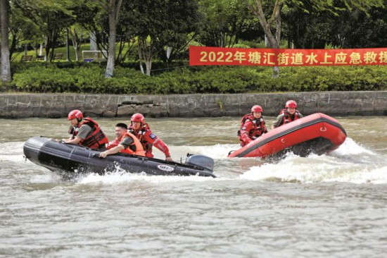 6月23日,嘉興經濟技術開發區暨塘匯街道2022年度防汛防臺應急救援演練在長纖塘開展。演練以“夯實防汛應急基礎·提升防汛處置能力”為主題,預設情況為因連續降雨導致河道水位暴漲,有多名群眾被困在對岸,由民兵和社區應急人員組成的應急救援隊迅速出動,以最快速度救援被困群眾。水上救援演練還包括拋繩器救人、槳板救援、救助落水人員等,此外還有應急救援設施操作使用實戰演練。(王蓉)