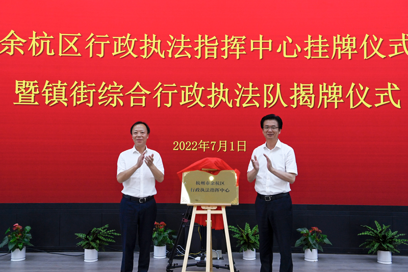 余杭區行政執法指揮中心掛牌暨鎮街綜合行政執法隊統一揭牌儀式。余杭區綜合行政執法局供圖