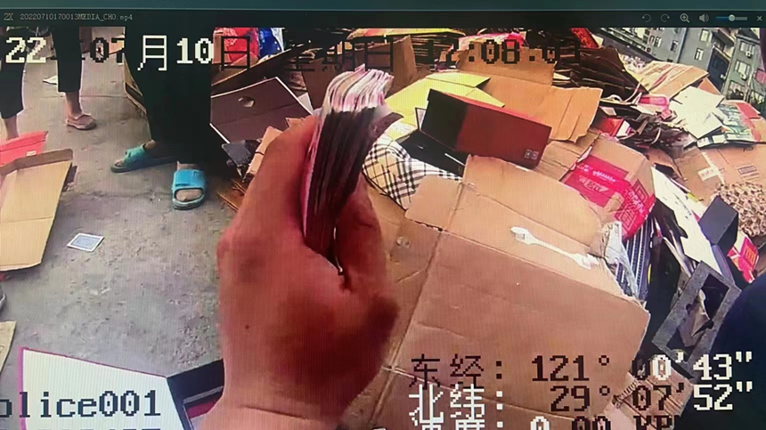 近40℃的氣溫,熱浪蒸騰。烈日下,民(輔)警們弓著身,在一片片廢品堆里仔細翻找,汗水已經把他們的警服浸透了。經過近一小時的努力,在報警人的電話描述下,民(輔)警找到了幾個外觀相近的紙盒,并在其中一個茶葉盒隱秘的夾層中,發現了一沓厚厚的人民幣。