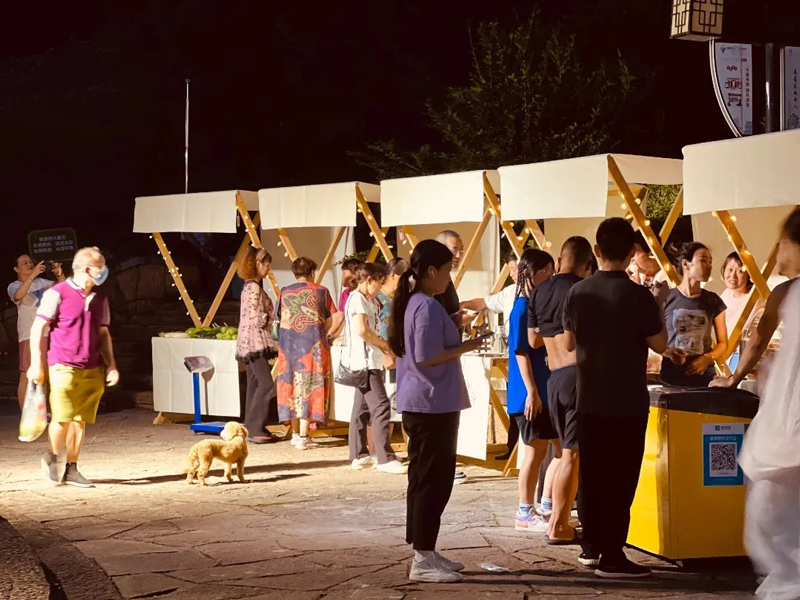 歌聲嘹亮,廣場上的鄉村文藝市集更是煙火氣十足。鄉野美食長廊、宋韻雅集的8個攤位前,不少游客購買水蜜桃、高山蔬菜、筍干等土特產品。七里鄉治嶺村村民徐建富帶來自家種植的100斤水蜜桃,一會兒就被一搶而空。