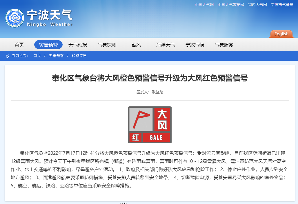 據悉,在該起事故發生前,寧波奉化區氣象臺于7月17日12時4分發布了雷電黃色預警信號,預警中提到“受強對流云團影響……局部地區還伴有小時雨強20至40毫米的短時暴雨和7至9級雷雨大風”。12時31分,當地氣象臺發布了大風橙色預警信號,12時41分又將大風橙色預警信號升級為最高級別的大風紅色預警信號。
