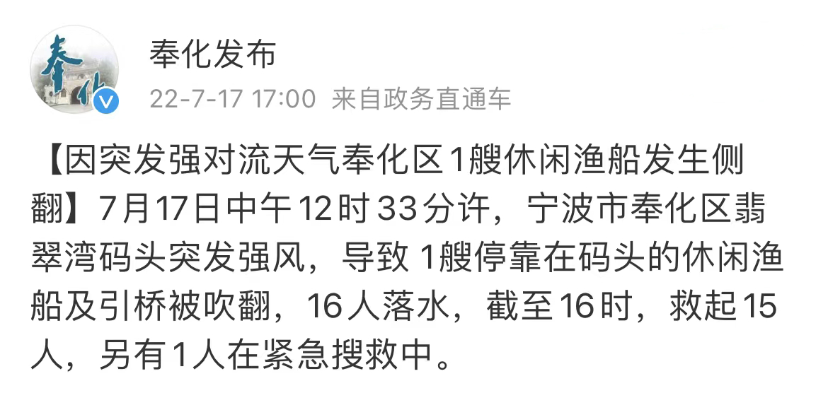 人民網杭州7月18日電 (艾宇韜)據“奉化發布”消息,7月17日中午12時33分許,寧波市奉化區翡翠灣碼頭突遭下擊暴流引發的11級強風,導致1艘??吭诖a頭的休閑漁船及引橋被吹翻,16人落水。