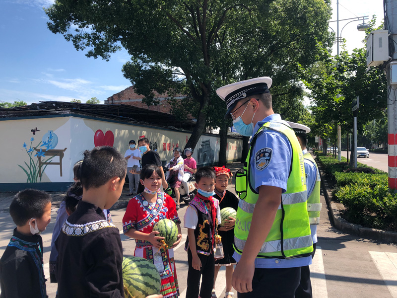 孩子們為交警送上親手種的西瓜。金海岳攝