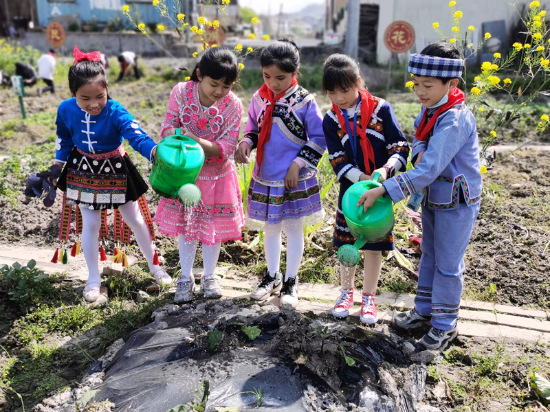 孩子們在“同心耕讀”農場為作物澆水。金海岳攝