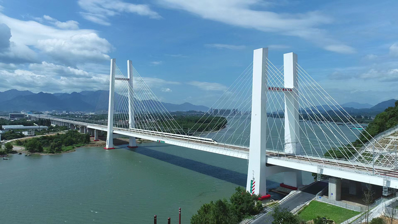 湖杭鐵路試運行,列車經過富春江特大橋。李夢竹攝