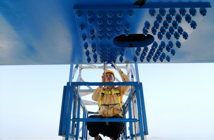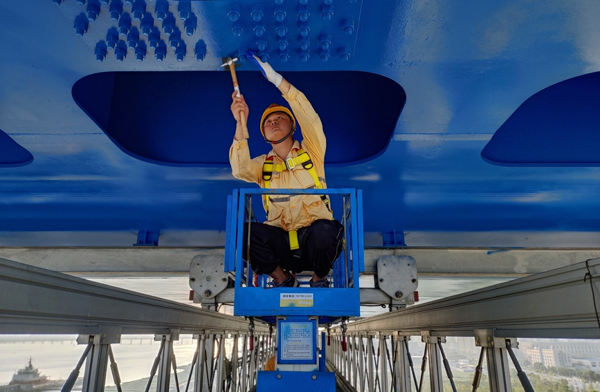 早上5點到中午12點,7個小時里,“守橋人”在不同節點、不同部位登高爬下,上下作業平臺約500余次,共敲擊了3000余個螺栓,檢查了3個吊圍欄、4個阻尼器和7個支座。