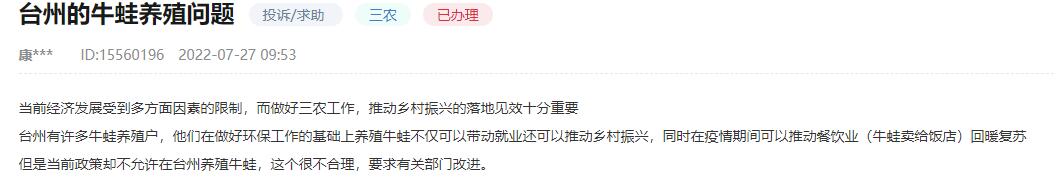 “當前經濟發展受到多方面因素的限制,而做好三農工作,推動鄉村振興的落地見效十分重要。臺州有許多牛蛙養殖戶,他們在做好環保工作的基礎上養殖牛蛙不僅可以帶動就業還可以推動鄉村振興……”近日,一位浙江臺州市民在人民網“領導留言板”上留言,對當地牛蛙養殖的相關政策提出自己的看法。他表示,在疫情期間養殖牛蛙可以推動餐飲業回暖復蘇,但當前政策卻不允許在臺州養殖牛蛙,這很不合理,希望有關部門改進。