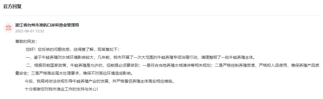 該留言得到了浙江省臺州市港航口岸和漁業管理局回應:鑒于牛蛙養殖對水域環境影響較大,小型養殖場排污處理能力不夠,很容易對環境造成破壞。為此,幾年前,臺州在全市范圍開展了一次大面積的牛蛙養殖專項治理行動,清理整頓了一批牛蛙養殖主體,引導牛蛙養殖戶們“綠色轉型”,所以目前市內相關經營主體比較少,引起了該網友的誤解。