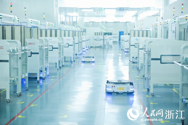 橫店東磁單晶電池片未來工廠的無塵車間里,AGV小車替代工人,承擔了物流搬運、上料、下料的工作。人民網 張帆攝