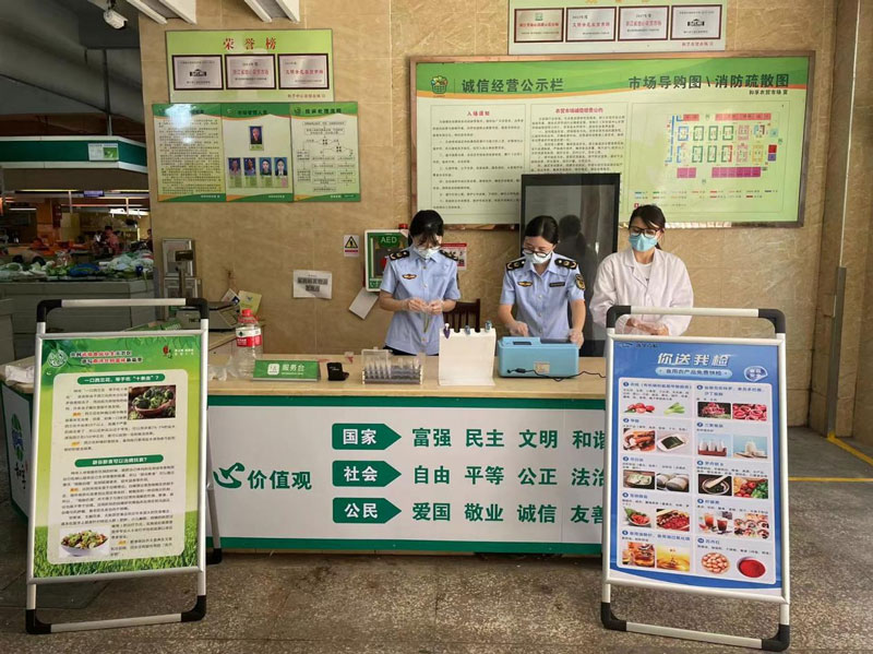 烈日炎炎,市民們格外關注食品安全,特別是蔬菜農藥殘留、水產品違禁藥物殘留等情況。為進一步普及食品安全知識,提升公眾對食品安全的參與度、感知度和滿意度,和孚市場監管所聯合檢測技術公司,共同開展了“你送我檢”“你點我檢”食品快檢進市場活動,讓群眾買得安心、吃得放心。
