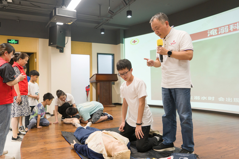培訓中,“救在身邊”應急救護志愿服務培訓公益團隊帶頭人閔華和團隊成員圍繞心肺復蘇的操作步驟、AED(體外自動除顫儀)使用方法、撥打120急救電話時的有效表達、創傷和溺水救護要領等內容,通過理論講解、實操演示和手把手教學等方式,為現場居民和學生細致講解了應急救護的流程與技巧。
