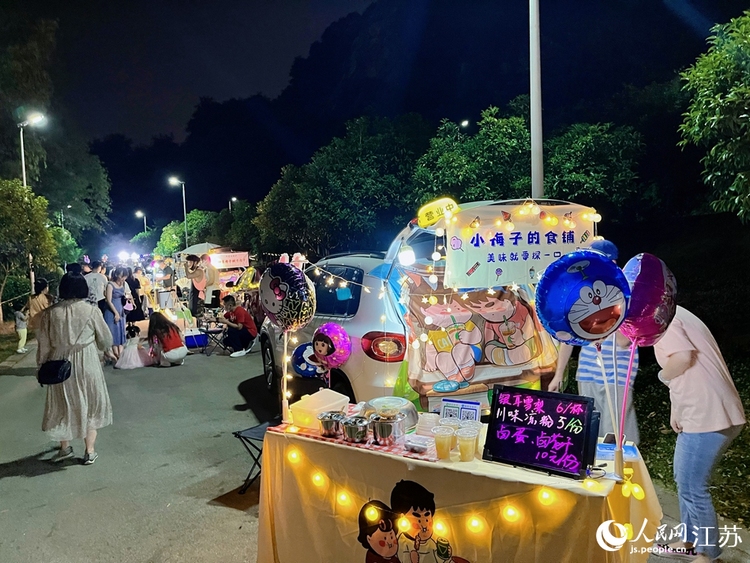 夜幕降臨,位于江蘇南京幕燕濱江風貌區的達摩長江夜公園人頭攢動,數百米的步道上,約50輛汽車敞開后備廂,霓虹閃爍。這是近日在達摩古洞景區舉辦的五馬渡汽車后備廂文化集市的火爆場面,“戶外蹦迪”“張母娘南京小吃研究所”“泰式椰子冰淇淋”等諸多特色攤位讓市民、游客流連忘返?!鞍滋焓蔷皡^,夜間免費開放成集市,吸引來的不只是小攤販,更有暢享閑暇時光的游客市民。敞開的后備廂不再只是夜游的‘氣氛組’,更成為景區、街區的‘新業態’,點亮了整個夜經濟?!本皡^負責人吳海青說。