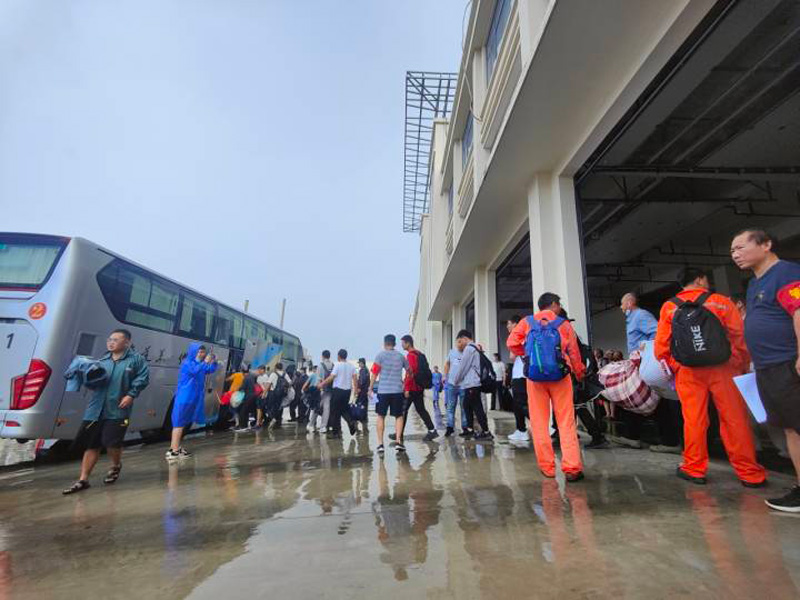 9月4日上午7時50分左右,在舟山綠色石化基地浙石化消防總站,島上中小型企業的4000余名務工人員,從這里集中出發轉移至舟山岱山本島。同一時間,岱山縣小魚山15號營地一公司按照網格化管理,自行開展人員離島轉移工作。據悉,9月4日,魚山島上共計12000余名務工人員將陸續被轉移至岱山縣體育館、岱山縣職業技術學校等場所安置。