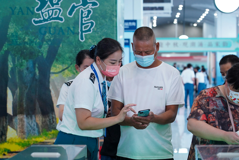 “鐵潮”服務隊員幫助乘客用智能支付刷卡進站。姚澤權攝
