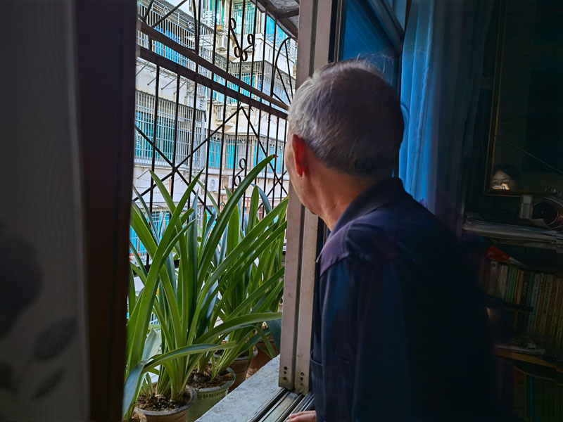 聶老每天都會站在陽臺往外看看鄰居們。林敏攝